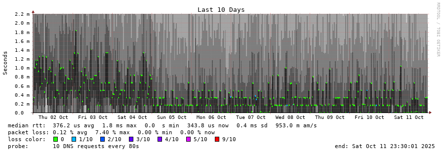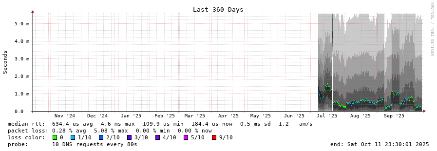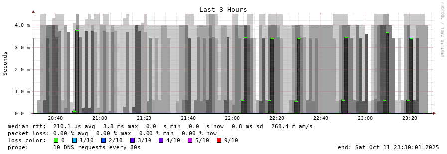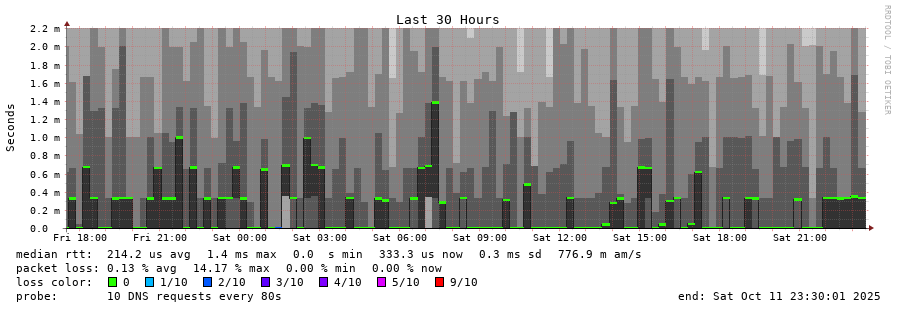 traceroute to 2620:fe::fe (2620:fe::fe), 30 hops max, 80 byte packets - Generated at 2025-10-11 23:15:01 3 > 2001:478:132::37 (2001:478:132::37) [*] 1.459ms 4.031ms 3.840ms 4 > 2620:fe::fe (2620:fe::fe) [AS19281] 0.242ms 0.232ms 0.192ms