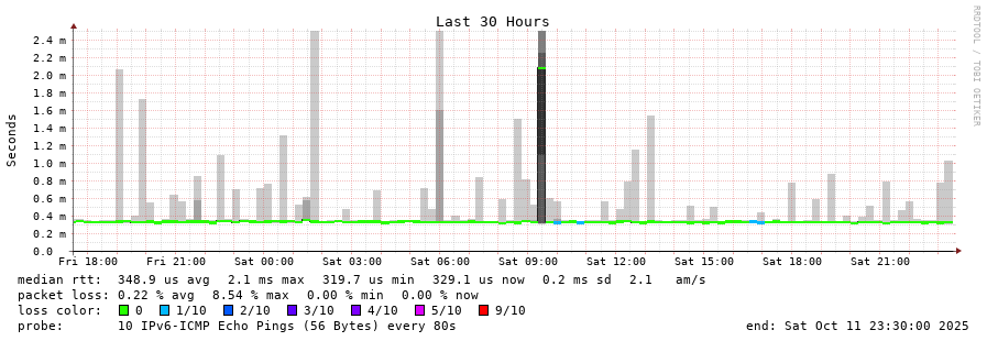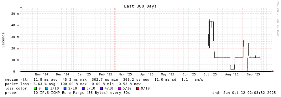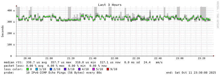 traceroute to www.akamai.com (2600:1402:b800:36::172f:cc98), 30 hops max, 80 byte packets - Generated at 2025-10-11 23:15:01