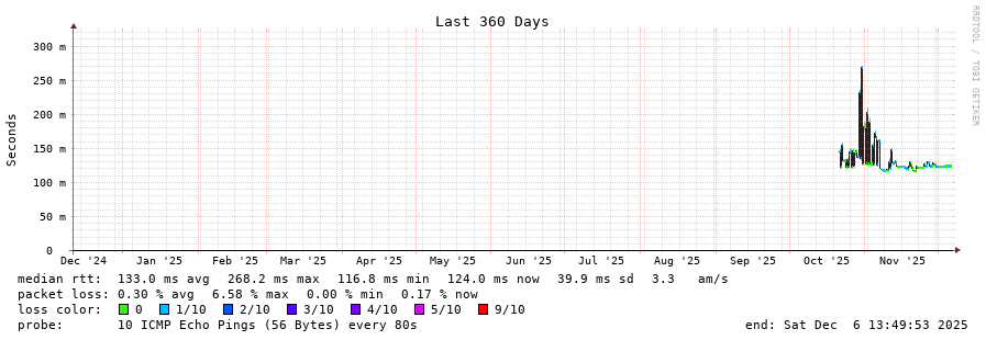 10 > 195.22.192.25 (195.22.192.25) [AS6762] 131.198ms 126.781ms 127.842ms