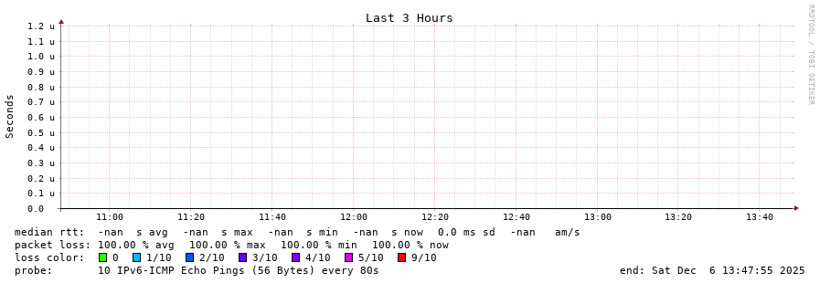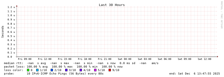 traceroute to fd78:93ae:fdfe::2 (fd78:93ae:fdfe::2), 30 hops max, 80 byte packets - Generated at 2025-12-06 13:45:01 3 > atl-b4-link.ip.twelve99.net (2001:2035:0:1f9c::1) [AS1299] 0.913ms !N0.468 ms!N
