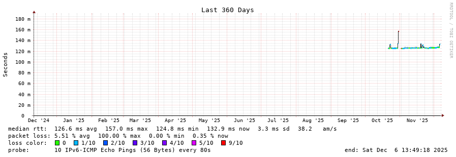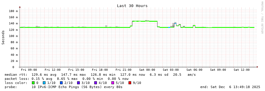 traceroute to 2001:67c:1e0:0:c225:e9ff:fea8:6a0a (2001:67c:1e0:0:c225:e9ff:fea8:6a0a), 30 hops max, 80 byte packets - Generated at 2025-12-06 13:30:02