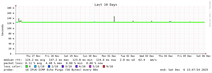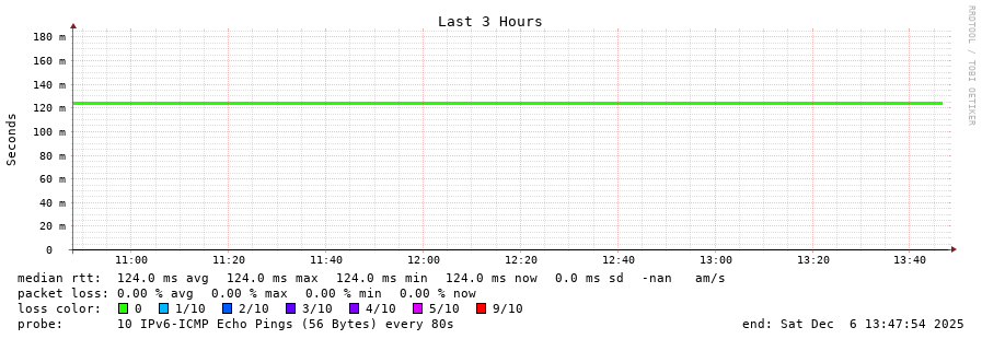 13 > 2001:730:2601:f005::2 (2001:730:2601:f005::2) [AS6830] 124.276ms 124.279ms 124.214ms
